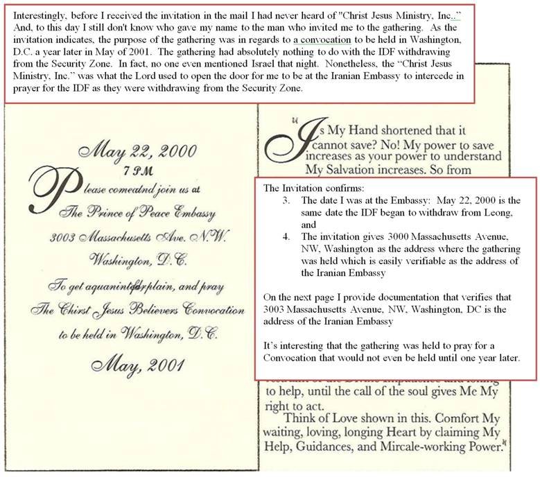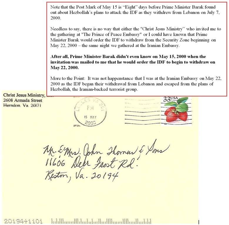 I will begin with the envelope and invitation from “Christ Jesus Ministry” who invited me to attend a Convocation that Pastor Schofield was allowing them to host that evening of May 22, 2000 at the Iranian Embassy. Note that the postmark on the invitation’s envelope was May 15, 2000 – Eight Days Before Israeli’s Prime Minister made the decision to begin the withdrawal on May 22, 2000 instead of the scheduled July 7, 2000 withdrawal.