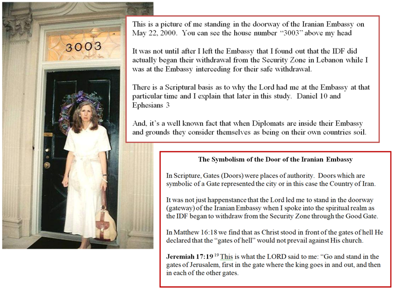 Divine Intervention: Needless to say, the Lord knew that after Prime Minister Barak found out on May 22 that Hezbollah was making preparations to turn the July 7 withdrawal into “an inferno” as the IDF withdrew, that Prime Minister Barak would order the IDF to begin their withdrawal that very night. Hence, that is why the Lord opened the door for me to stand in the Gateway of Israel’s enemies at the Iranian Embassy and in the Name of Jesus, by His power and authority, to speak into the spiritual realm and command the principalities, specifically the Prince and Kings of Persia (Daniel 10) operating through Hezbollah to move away from the Fatima Gate as the IDF withdrew from Lebanon back onto the safety of Israeli soil.