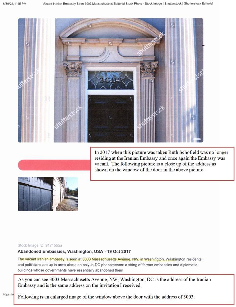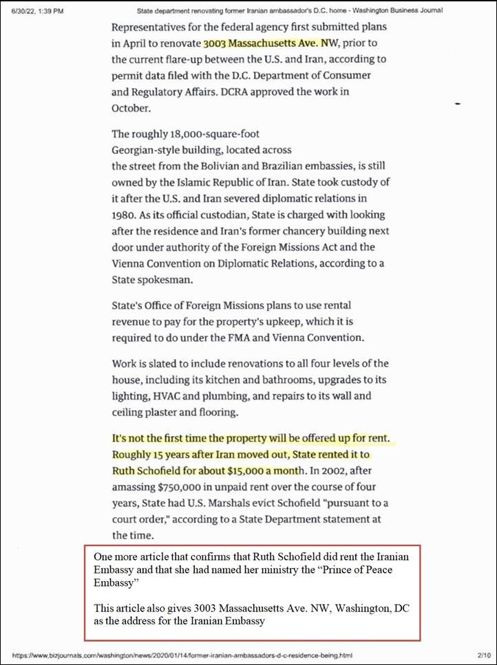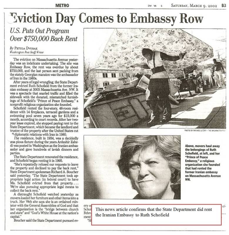 The next two pages confirm that the State Department did rent the Iranian Embassy to Ruth Schofield – however, she was eventually evicted for not paying the rent. Following these 2 pages is a Washington Post Article dated March 9, 2002 of Ruth Schofield’s eviction. I’m including this article as just one more confirmation that there was a Christian Ministry at the Iranian Ministry – the article includes the address of 3003 Massachusetts Avenue, NW, Washington, DC as well as Ruth Schofield’s name and the name of her ministry “Prince of Peace Embassy.” |