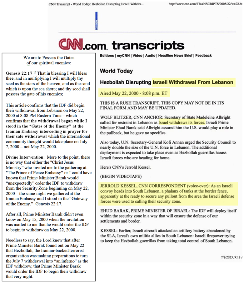 The next image is of a CNN Article that was posted on May 22, 2000 at 8:08 PM Eastern Time that confirms the IDF did begin their withdrawal from Lebanon on May 22, 2000 while I was at the Iranian Embassy. |