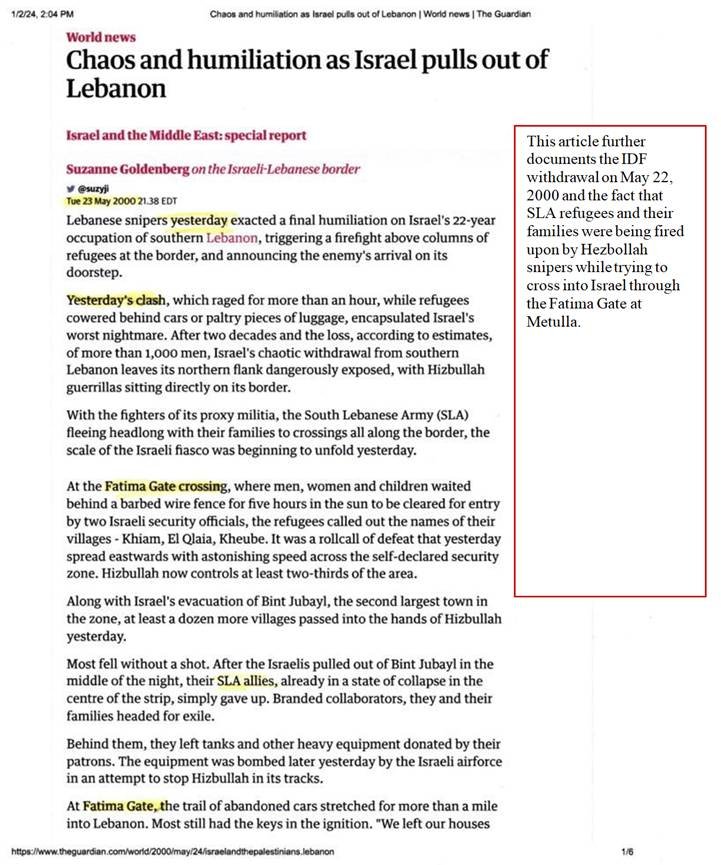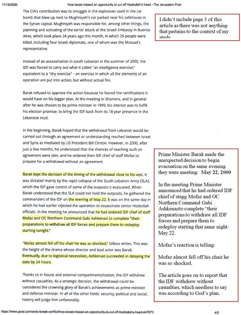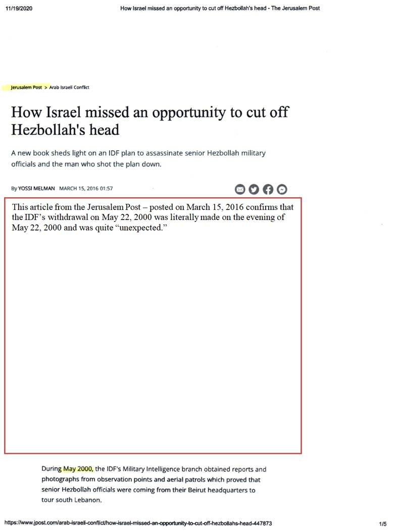 The following article from the Jerusalem Post – posted on March 15, 2016 confirms that the IDF’s withdrawal on May 22, 2000 was literally made on the evening of May 22, 2000 and was quite “unexpected.”