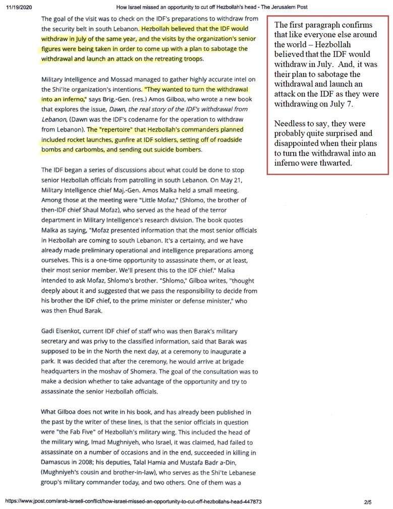 "Hezbollah believed that the IDF would withdraw in July of the same year, and the visits by the organization's senior figures were being taken in order to come up with a plan to sabotage the withdrawal and launch an attack on the retreating troops. Military intelligence and Mossad managed to gather highly accurate intel on the Shi'ite organization's intentions. 'They wanted to turn the withdrawal into an inferno,' says Brig-Gen (res.) Amos Gilboa. ….. The 'repertoire that Hezbollah's commanders planned included rocket launches, gunfire at the IDF soldiers, setting off at roadside bombs and car bombs, and sending out suicide bombers."