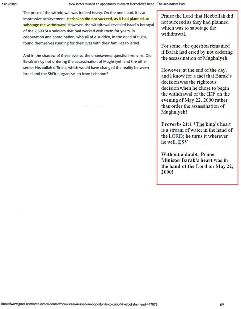 And, those who understand the Biblical principles of Ephesians 3:10, Ephesians 6:12 and 2 Corinthians 10:4 understand that it wasn't until the night of May 22, 2000 when the IDF started to withdraw from the Security Zone that the principalities operating behind Iranian-backed Hezbollah realized that the Lord had foiled their plans to turn the IDF's withdrawal into an inferno on July 7, 2000 when they thought the IDF would withdraw from the Security Zone.