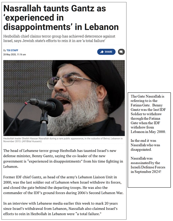 Hezbollah was Defeated and driven north of Lebanon’s Litani River by the Israeli Defense Forces where they were no longer a military threat to the Galilee. On October 27, 2024 Hezbollah was Forced to bow their knee and end its the “Front Line” of Lebanon’s Involvement in the October 7, 2023 War started by Hamas. Israeli Defense Forces had come full circle and gone back up to Fatima Gate and crossed back over the border to the Security Zone that they withdrew from in May of 2000 and had RETAKEN control of Hezbollah’s stronghold: Kfar Kila.