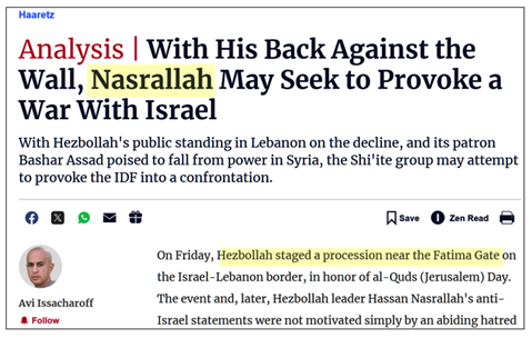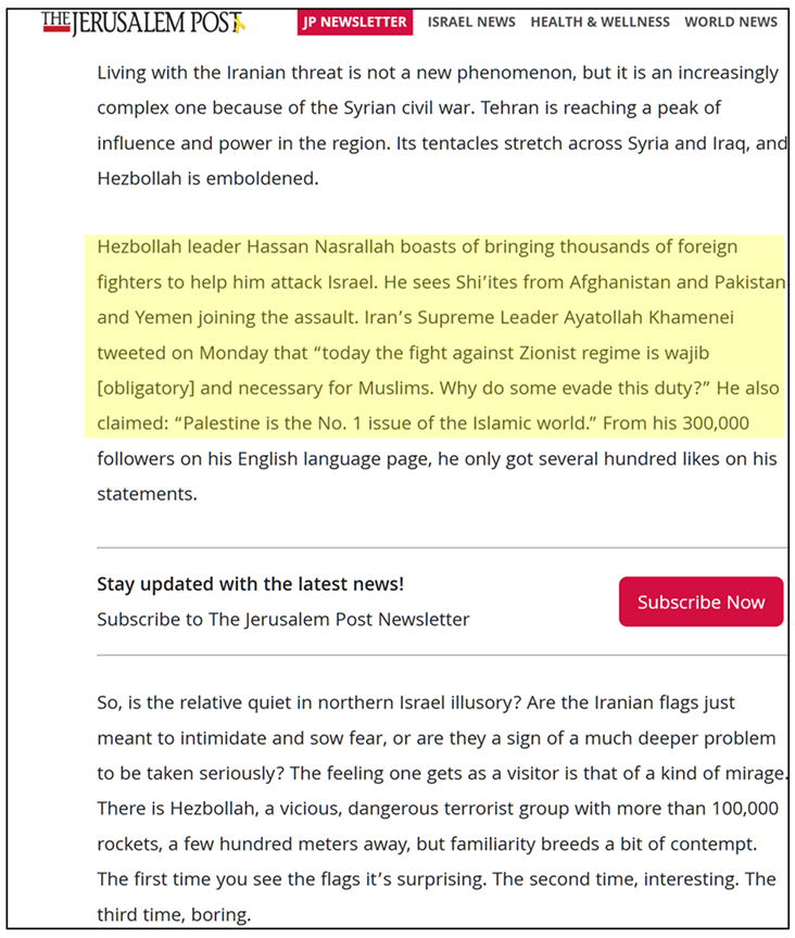 For example, Iran and Hezbollah let the entire International Community know that the “Fatima Gate” was their “Front Line” in their ongoing battles with Israel and their goal to invade and conquer Israel’s Galilee. In a post on the Haaretz website on August 17, 2012, Avi Issacharoff wrote about a staged procession by Nasrallah near the Fatima Gate (excerpt below). |