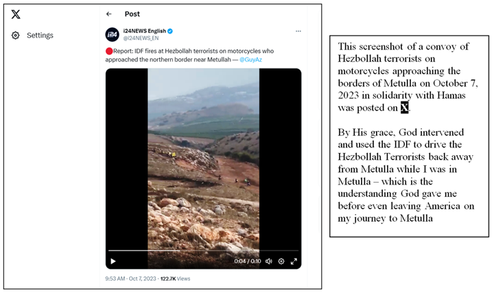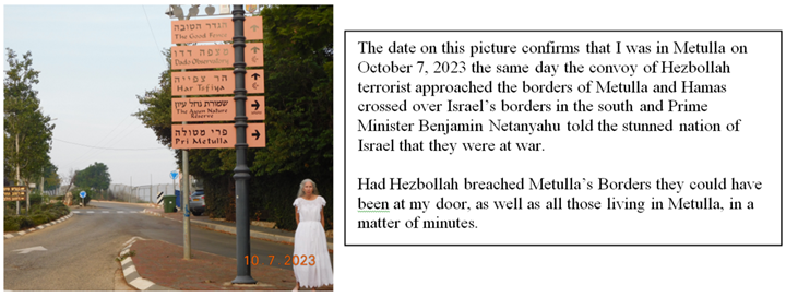 It is because God called me to stand in spiritual gateways that I was standing in the “Fatima Gate” in Metulla on the border Israel shares with Lebanon on the day Hamas attacked Israel and a convoy of Hezbollah Terrorists on motorcycles attempted to cross over the border to Metulla where I was staying. It is because I was led by the Holy Spirit to leave America and travel to the Gateway of the Enemy: the “Fatima Gate.” The Holy Spirit quickened me to be there on the border during the Feast of Tabernacles which was when Hamas attacked Israel on the last day of the Feast of Tabernacles (Sukkot).