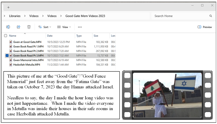 The following screenshot is from a preview pane in Windows File Explorer and documents that I made an hour-long video on October 7, 2023, the day Hamas attacked Israel, at the “Good Fence Memorial.” In the picture displayed on the Preview Pane in Windows File Explorer you can see Lebanon behind where I am sitting. |