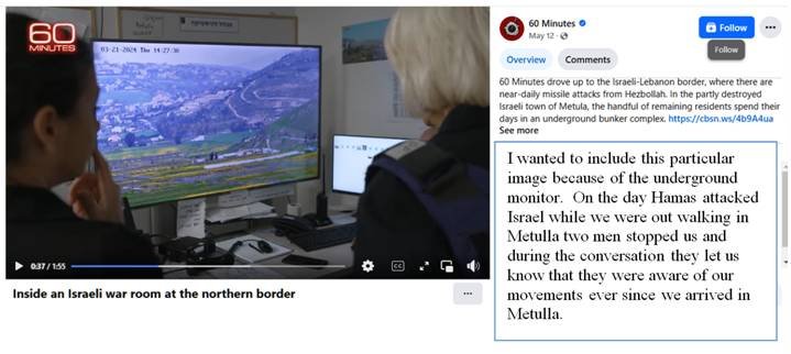 The following two screenshots are of the same video but were taken from an interview posted online by CBN News Dateline that was conducted inside Metulla’s War Room where they monitor incoming fire coming from the hillside of Lebanon.