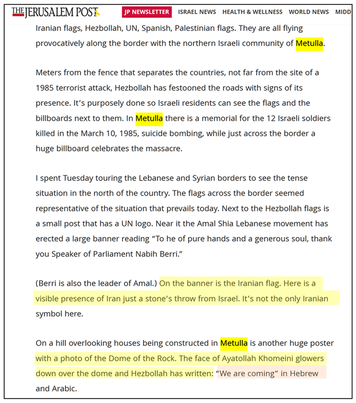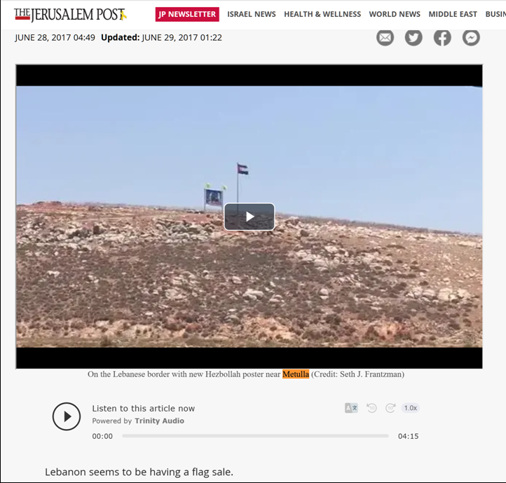 The following Jerusalem Post Newsletter article posted on June 28, 2017 (updated on June 29, 2017) by Seth J. Frantzman reads in part: “…On a hill overlooking houses being constructed in Metulla is another huge poster with a photo of the Dome of the Rock. The face of Ayatollah Khomeini glowers down over the dome and Hezbollah has written: ‘We are coming’ in Hebrew and Arabic.’”