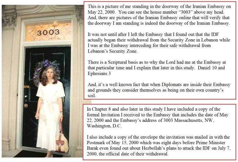Spiritual Warfare: And, as the IDF soldiers began their “unexpected” withdrawal from Lebanon on May 22, 2000, in obedience to the Lord and by His Divine Intervention I was at the Iranian Embassy in Washington, D.C. engaged in spiritual warfare with the principalities operating through the Iranian-backed terrorist: Hezbollah.