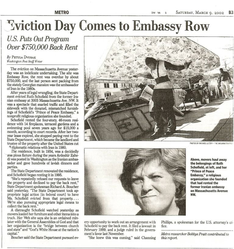 The next two pages confirm that the State Department did rent the Iranian Embassy to Ruth Schofield – however, she was eventually evicted for not paying the rent. Following these 2 pages is a Washington Post Article dated March 9, 2002 of Ruth Schofield’s eviction. I’m including this article as just one more confirmation that there was a Christian Ministry at the Iranian Ministry – the article includes the address of 3003 Massachusetts Avenue, NW, Washington, DC as well as Ruth Schofield’s name and the name of her ministry “Prince of Peace Embassy.” |