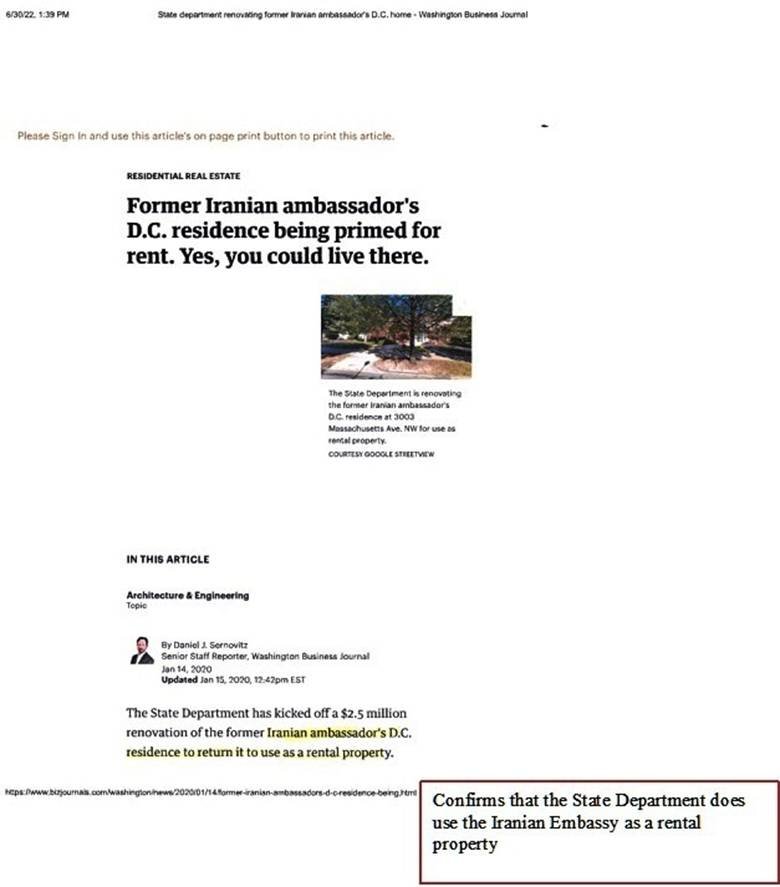 Copy of Newspaper Articles that the U.S. State Department did rent the vacant Iranian Embassy to Pastor Ruth Schofield and that the Iranian Embassy is once again a rental property. |
