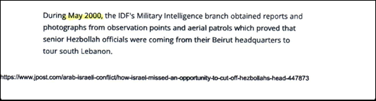 The first paragraph confirms that like everyone else around the world – Hezbollah believed that the IDF would withdraw in July. And, it was their plan to sabotage the withdrawal and launch an attack on the IDF as they were withdrawing on July 7th.