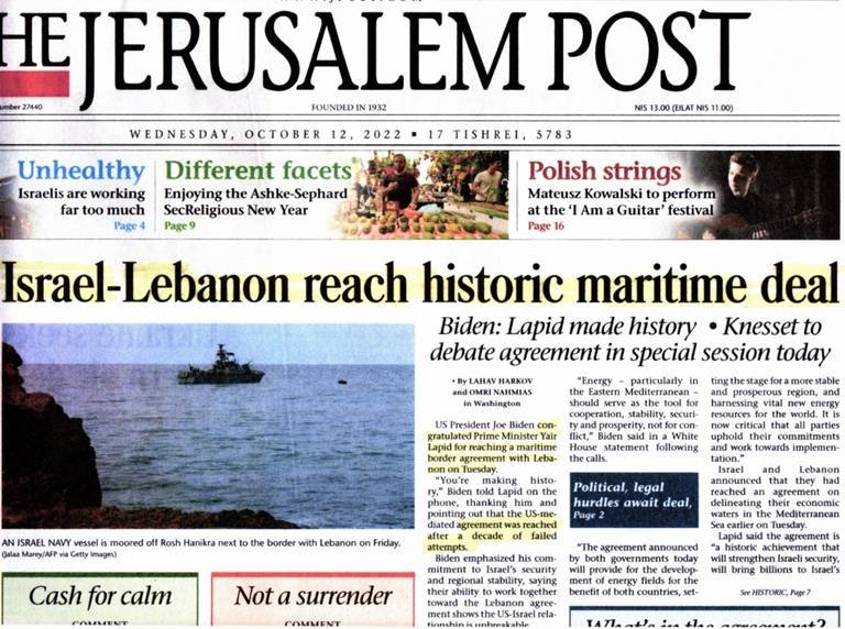 The following Press Release dated on October 11, 2022 is from Israel’s “Ministry of Foreign Affairs” that clearly states that Israel and Lebanon reached a historic agreement settling the maritime dispute with Lebanon on “Tuesday, 11 October 2022. |