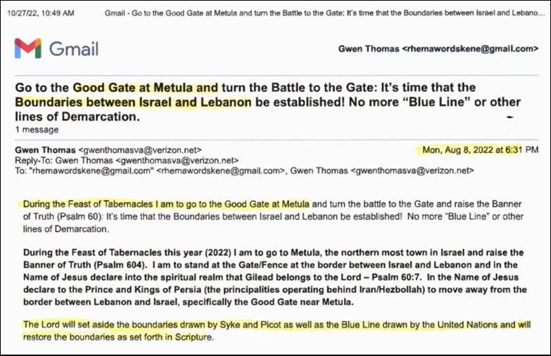 The email that I sent to myself on August 8, 2022 explains that I was to go and stand in the “Good Gate” in Metulla during the Feast of Tabernacles and declare into the spiritual realm that it was God’s Timing that a Boundary was to be established, hence, the “Maritime Border Agreement” was finally signed after “Ten Years” of negotiations!
