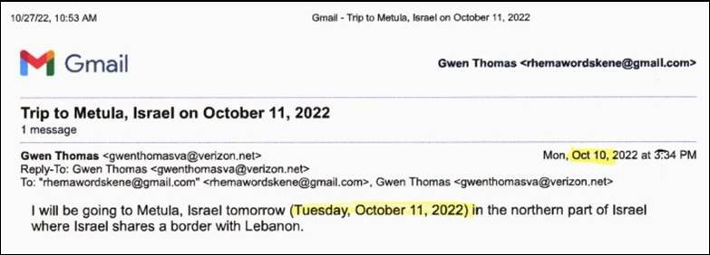 The email that I sent to myself on October 10, 2022 from my hotel room in Jerusalem reveals that I was going to Metulla on October 11, 2022. Again, until October 11, 2022 when they actually signed the Agreement, no one knew “if” or “when” Israel and Lebanon would actually sign the agreement. Over the past ten years every time the international community thought Israel and Lebanon would finally sign the agreement, it would fall through. That is, until October 11, 2022, which was according to God’s timing!