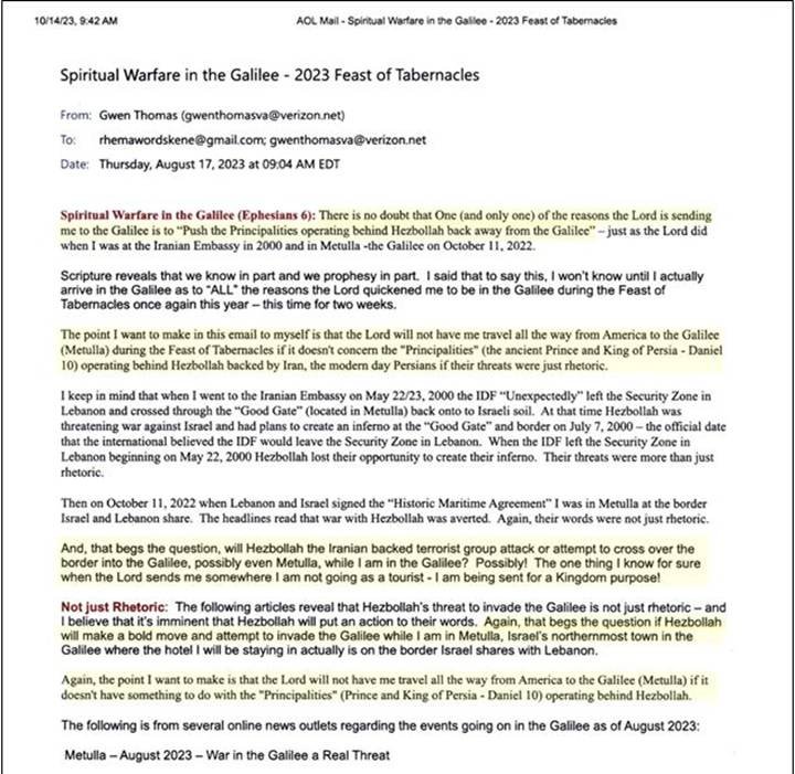 The Email of August 17, 2023 Confirms it was God’s Will that I was in Metulla Israel on October 7, 2023 when war broke out between Israel and Hamas.