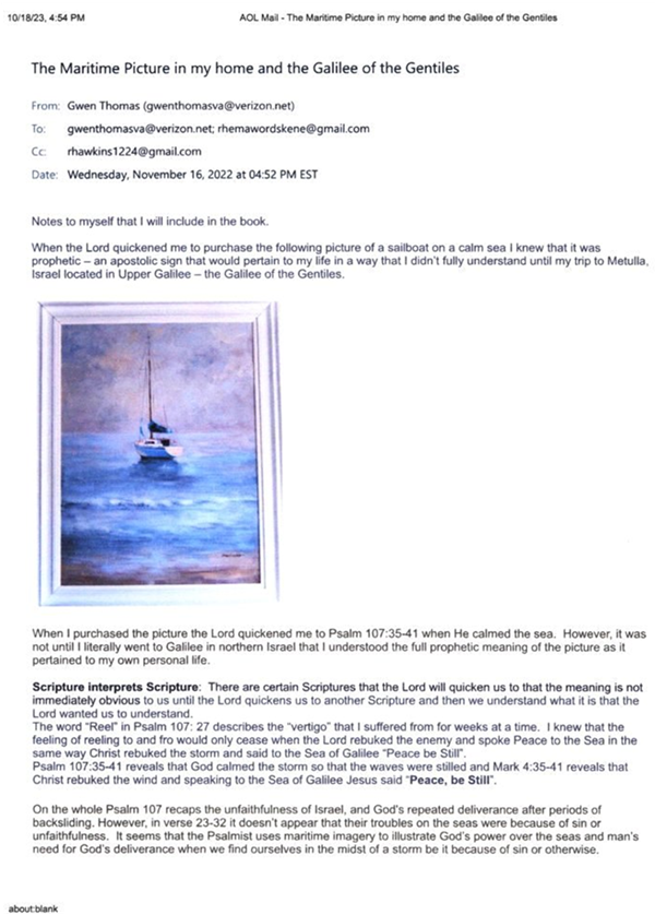 2. The “Greater Fulfillment” of the Second Prophecy came to Pass when I was Evacuated from Metulla to the “Safe Harbor” of the “Selina Kinneret” on the shores of the “Sea of Galilee”: The second prophecy that I emailed to myself was of a 3½ by 4½ foot picture of a “Boat on the Sea” that the Lord quickened me to purchase and hang in my home in the fall of 2022. To discern the meaning of the picture, the Lord quickened me to Psalm 107 and that He was going to take me to a safe harbor, which I discerned to be the “Sea of Galilee.”