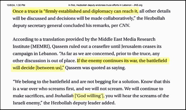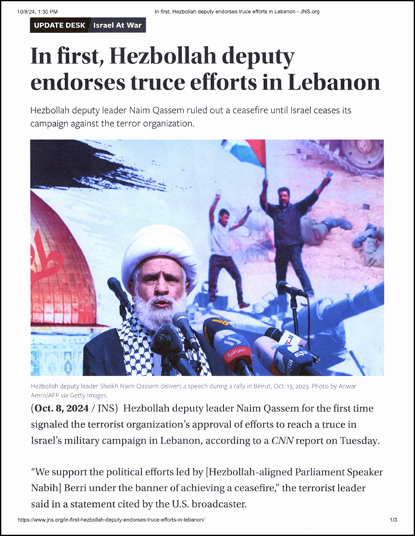 The headlines of a news article posted on “Newsmax World” Tuesday, October 8, 2024 read, “Hezbollah Now Talking Cease-Fire Without Hamas Condition.” Following are Excerpts from this particular news article: